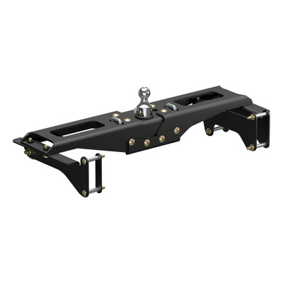 Ingenious design and reliability -- these words don't just describe the Chevrolet Silverado and GMC Sierra 2500 HD and 3500 HD; they were the inspiration for the CURT OEM-style gooseneck hitch for GM. This hitch is built to excel in two key things: ease of installation that comes from an ingenious design and safe, reliable towing even with heavy-duty gooseneck trailers. The Chevy / GMC-compatible gooseneck hitch boasts a one-person installation. It is built with fewer pieces than competitor hitches to keep installation simple, and the pieces are designed to be compact so they can be lifted and bolted into place without the help of a second person. We've also eliminated a number of steps from the process to speed up installation time and reduce the number of modifications needed on the vehicle. The hitch does not require the exhaust or spare tire to be lowered. It requires no welding, temporary truck bed removal or even bed flange trimming. Best of all, pre-existing factory holes are used to mount the hitch to the truck's frame, meaning the only drilling necessary is for the gooseneck ball hole and safety chains in the truck bed. Once installed, the OEM-style gooseneck hitch for Chevrolet / GMC offers simple operation and highly secure towing. It is tested in accordance with SAE J2638 to safely tow up to 38,000 lbs. GTW. Instead of a side handle mounted under the wheel well, it uses a latch-locking trailer ball. This patented 2-5/16" ball easily drops into the gooseneck head from above the truck bed and is secured in place with a simple quarter-turn of the latch. This Chevrolet Silverado / GMC Sierra 2500 HD and 3500 HD gooseneck hitch also features heavy-duty 5/8" safety chain anchors for dependable security for your trailer, whether you're towing livestock, machinery or construction materials. To ensure maximum quality, the CURT OEM-style gooseneck hitch for GMC and Chevrolet comes with a tough A-coat finish to easily resist rust and scratches.