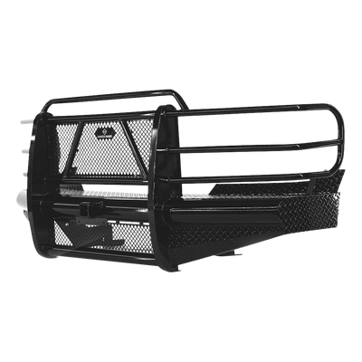 The Ranch Hand Legend front bumper is one of the toughest on the market. It is frame-mounted and has a one-piece, fully-welded construction that collectively reduces vibration, prevents rattling and ensures a secure fit. The main body of the bumper is manufactured from 4" schedule-40 pipe and diamond-plate steel, and the grille guard portion is composed of 12-gauge tubing, providing wraparound headlight protection. The punched plate grille insert is specifically designed to match the make and model of the truck with no expanded metal used. The Legend bumper comes standard with a 2" receiver, and most applications keep tow hooks and factory fog lights. It is constructed with a super polyester black powder coat finish to defend against corrosion for ultimate protection and durability. Originally designed for ranchers and farmers that needed more than a tough looking bumper -- but rather one that could assist in a full day's work -- this is the iconic ranch-style bumper that started it all and paved the way for those behind it that only aspire to duplicate. This particular Legend bumper with grille guard fits select model years of the Chevrolet Silverado 2500 HD and Chevrolet Silverado 3500 (see application info to verify fitment).
