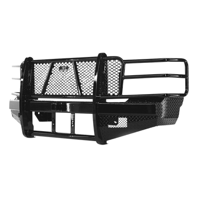The Ranch Hand Sport front bumper provides extra protection for your truck, featuring wraparound grille-guard-style headlight protection. The winch mount comes standard, integrated with the formed channel, and it is rated for up to 16,500 pounds for unmatched strength that is ready to stand up to every challenge. The Sport is made with high-strength 1/4" formed C-channel and diamond-plate steel for dependable front-end strength. It comes equipped with custom-punched grille inserts to match the truck grille pattern for a complete look, and it is engineered to be a direct replacement for your truck's factory bumper. This particular Sport front bumper with grille guard fits select model years of the Chevrolet Silverado 2500 HD and Chevrolet Silverado 3500 HD (see application info to verify fitment). The Sport bumper by Ranch Hand is highly adaptable, featuring a standard 2" receiver to be used for a tow hook, skid plate or other attachments. Additionally, Sport adds some serious attitude with its sleek but stout style, providing an aggressive look to your front-end. Finished with a tough polyester black powder coating, the Sport front bumper is built for quality and longevity, suited for work or play. Seize every day and make every adventure count with the Sport front bumper.
