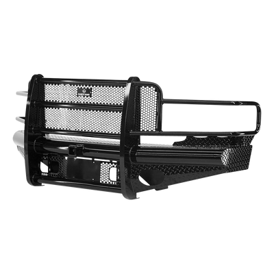 The Ranch Hand Legend front bumper is one of the toughest on the market. It is frame-mounted and has a one-piece, fully-welded construction that collectively reduces vibration, prevents rattling and ensures a secure fit. The main body of the bumper is manufactured from 4" schedule-40 pipe and diamond-plate steel, and the grille guard portion is composed of 12-gauge tubing, providing wraparound headlight protection. The punched plate grille insert is specifically designed to match the make and model of the truck with no expanded metal used. The Legend bumper comes standard with a 2" receiver, and most applications keep tow hooks and factory fog lights. It is constructed with a super polyester black powder coat finish to defend against corrosion for ultimate protection and durability. Originally designed for ranchers and farmers that needed more than a tough looking bumper -- but rather one that could assist in a full day's work -- this is the iconic ranch-style bumper that started it all and paved the way for those behind it that only aspire to duplicate. This particular Legend bumper with grille guard fits select model years of the Dodge Ram 2500 and Dodge Ram 3500 (see application info to verify fitment).