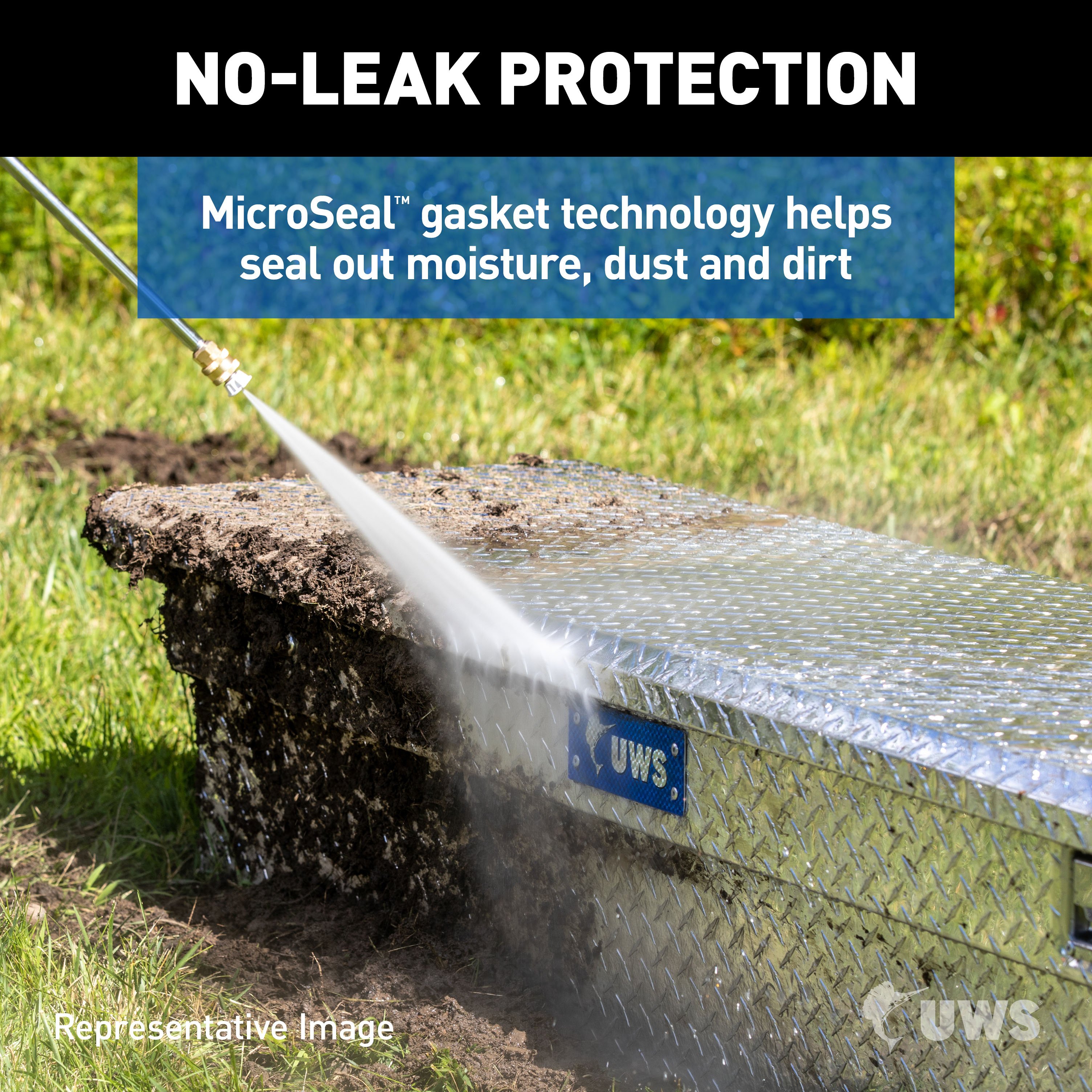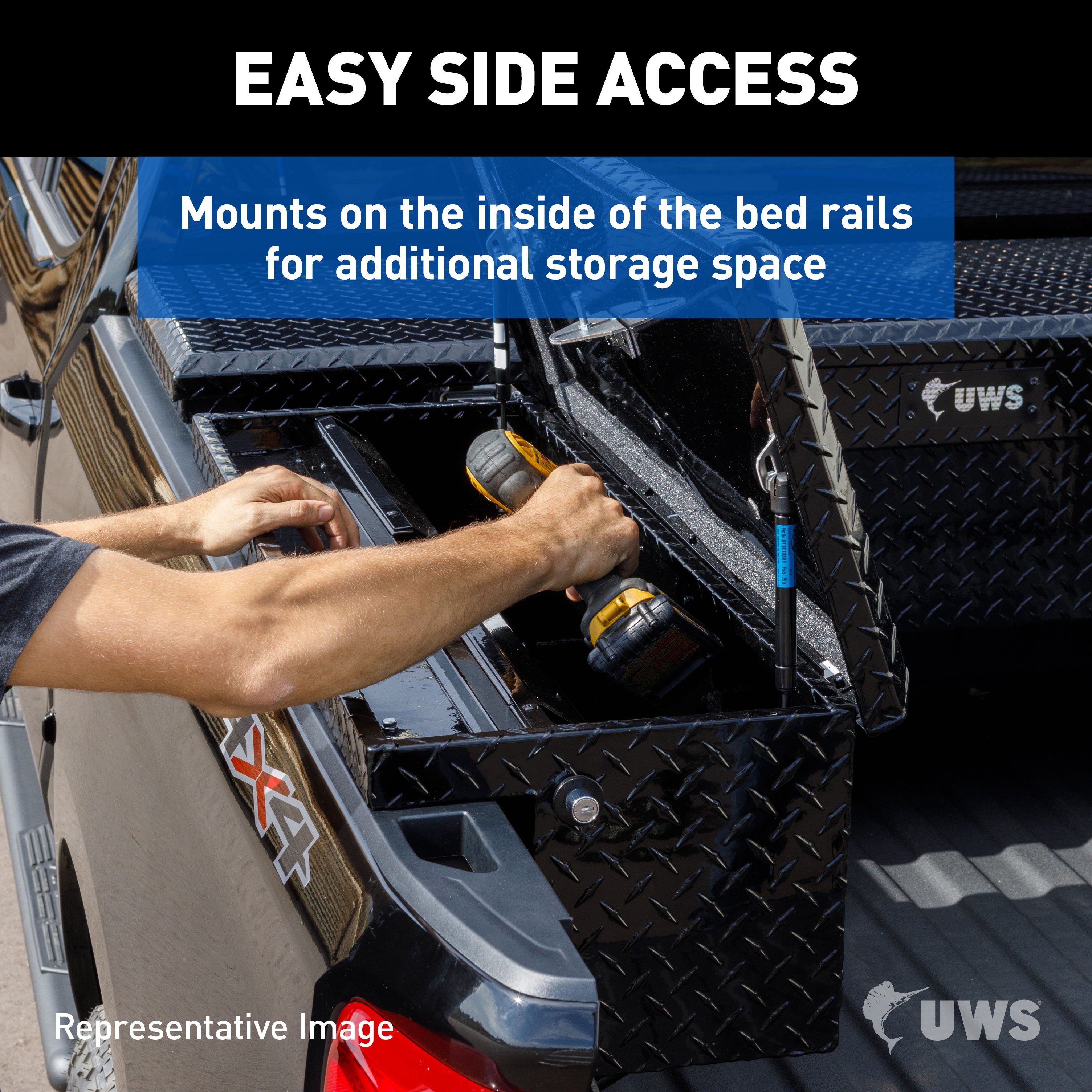UWS truck side tool boxes provide unbeatable storage and security for your items in the bed of your truck. Each box features a corrosion-resistant aluminum construction, a stainless steel locking system and a patented RigidCore foam-filled lid -- all to keep your equipment and valuables safe, well-organized and easily accessible whenever needed. Each UWS truck tool box is constructed from extra-thick aluminum for increased structural strength. The tub is welded together into a single piece for weather resistance and to easily hold heavy tools and other items. The lid features a patented RigidCore foam-filled design, sandwiched between two aluminum plates. This greatly increases the strength of the lid and helps prevent bending and warping, making operation very smooth. The locking mechanism of the UWS truck side tool box provides excellent security for your items, featuring a stainless steel, key-operated paddle handle for long-lasting corrosion resistance. For solid protection against the elements, the lid also has a MicroSeal gasket, blocking moisture, dust and insects from getting inside and damaging your valuables. The lid also opens a full 90 degrees for easier access, and it is equipped with self-opening struts for convenient operation when your hands are full. This particular truck side box also comes with space-saving universal legs. The legs have pivoting brackets to be highly adjustable, allowing them to be mounted virtually anywhere on the box and truck bed wall for a secure installation. The unique design maintains a smaller footprint in the truck bed, opening up the space for more cargo. UWS truck tool boxes are available in multiple sizes to accommodate any storage need. Like all UWS products, each one is proudly assembled right here in the USA for style and long-lasting dependability (NOTE: This product is heavily packaged for parcel shipping). UWS truck side tool boxes provide unbeatable storage and security for your items in the bed of your truck. Each box features a corrosion-resistant aluminum construction, a stainless steel locking system and a patented RigidCore foam-filled lid -- all to keep your equipment and valuables safe, well-organized and easily accessible whenever needed. Each UWS truck tool box is constructed from extra-thick aluminum for increased structural strength. The tub is welded together into a single piece for weather resistance and to easily hold heavy tools and other items. The lid features a patented RigidCore foam-filled design, sandwiched between two aluminum plates. This greatly increases the strength of the lid and helps prevent bending and warping, making operation very smooth. The locking mechanism of the UWS truc k side tool box provides excellent security for your items, featuring a stainless steel, key-operated paddle handle for long-lasting corrosion resistance. For solid protection against the elements, the lid also has a MicroSeal gasket, blocking moisture, dust and insects from getting inside and damaging your valuables. The lid also opens a full 90 degrees for easier access, and it is equipped with self-opening struts for convenient operation when your hands are full. This particular truck side box also comes with space-saving universal legs. The legs have pivoting brackets to be highly adjustable, allowing them to be mounted virtually anywhere on the box and truck bed wall for a secure installation. The unique design maintains a smaller footprint in the truck bed, opening up the space for more cargo. UWS truck tool boxes are available in multiple sizes to accommodate any storage need. Like all UWS products, each one is proudly assembled right here in the USA for style and long-lasting dependability (NOTE: This product is heavily packaged for parcel shipping).